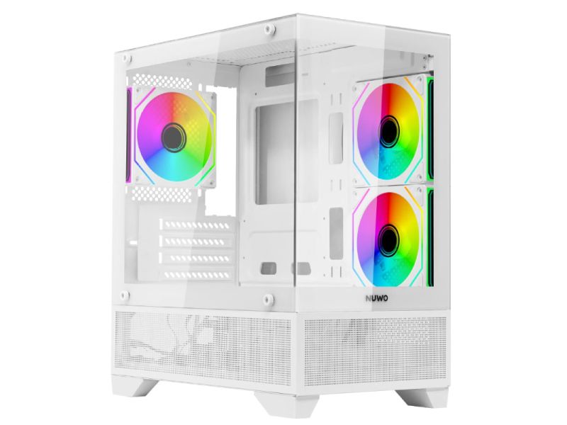 Il Nuwo Flow FH100 (codice CS0324JP-FH100) è un case Tower in formato Micro-ATX progettato per chi desidera costruire un PC con illuminazione ARGB, estetica moderna e buona gestione termica senza rinunciare a un design pulito e curato. Proposto in colorazione bianca, il Flow FH100 si distingue immediatamente per il pannello laterale full-size in vetro temperato che offre piena visibilità dei componenti interni e dell'illuminazione ARGB, trasformando ogni build in un elemento visivo di impatto. Il case è fornito senza alimentatore (No PSU), lasciando piena libertà nella scelta del gruppo di alimentazione più adatto alla propria configurazione.