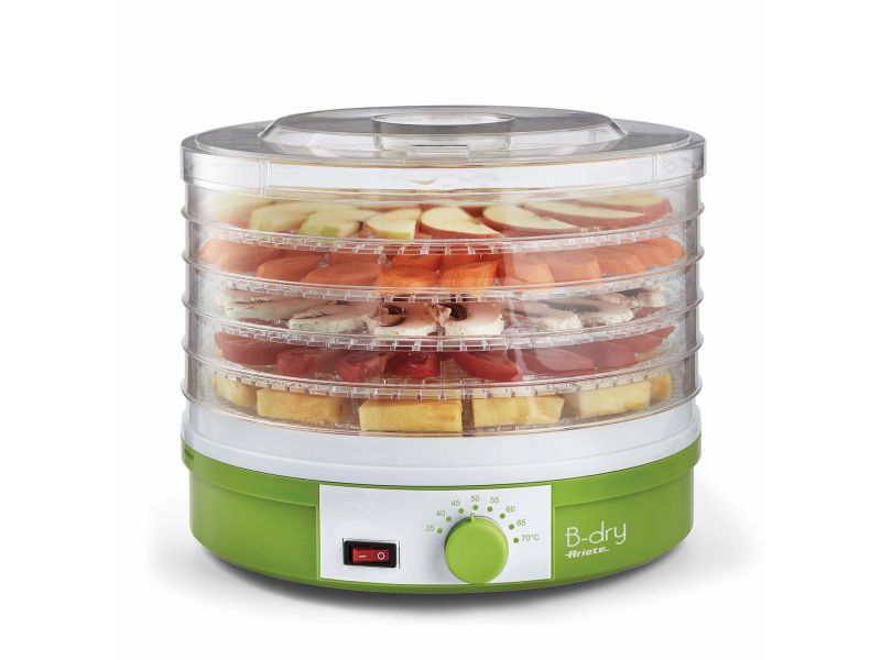 L’essiccatore B-dry è il prodotto perfetto per combinare sapore e gusto con una cucina sana e leggera. Grazie alla distribuzione uniforme del calore, con una temperatura regolabile da 35°C a 70°C, l’essiccatore Ariete assicura l’evaporazione dell’acqua e, allo stesso tempo, il mantenimento di un ottimo livello di sali minerali e vitamine negli alimenti disidratati. B-dry è composto da 5 cestelli trasparenti con coperchio perfetti per controllare l’avanzamento del processo di essiccazione. I diversi scompartimenti all’interno possono essere utilizzati per essiccare contemporaneamente differenti pietanze e sono 100% BPA Free, quindi realizzati senza bisfenolo A e sicuri per la tua salute e quella di tutta la famiglia.
