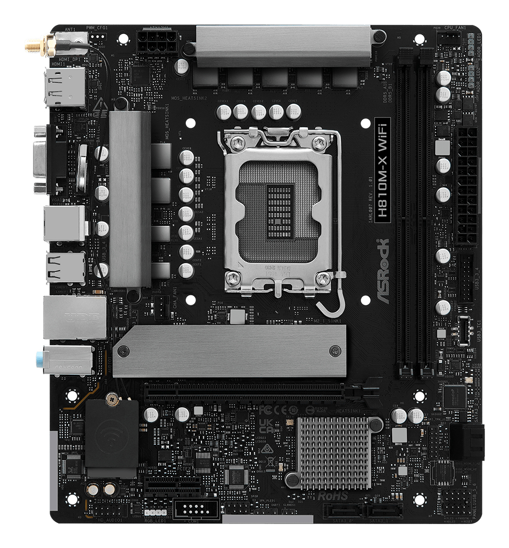 Asrock H810M-X WiFi. Produttore processore: Intel, Presa per processore: LGA 1851 (Socket V1), Processori compatibili: Intel Core Ultra (Series 2). Tipi di memoria supportati: DDR5-SDRAM, RAM massima supportata: 128 GB, tipo di slot di memoria: DIMM. Interfacce dell'unità di archiviazione supportate: M.2, SATA III, Tipi di unità di archiviazione supportate: HDD & SSD. Tipo di interfaccia Ethernet: 2.5 Gigabit Ethernet, Controller LAN: Dragon RTL8125BG, Wi-Fi standard: Wi-Fi 5 (802.11ac). Componente per: PC, Fattore di forma scheda madre: micro ATX, Famiglia di chipset per scheda madre: Intel