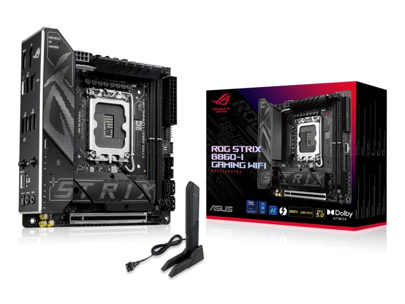 ASUS ROG STRIX B860-I GAMING WIFI. Produttore processore: Intel, Presa per processore: LGA 1851 (Socket V1), Processori compatibili: Intel Core Ultra (Series 2). Tipi di memoria supportati: DDR5-SDRAM, RAM massima supportata: 128 GB, tipo di slot di memoria: DIMM. Interfacce dell'unità di archiviazione supportate: M.2, SATA III, Tipi di unità di archiviazione supportate: HDD & SSD, Livelli RAID: 0, 1, 5, 10. Tipo di interfaccia Ethernet: 2.5 Gigabit Ethernet, Wi-Fi standard: Wi-Fi 7 (802.11be). Componente per: PC, Fattore di forma scheda madre: mini ITX, Famiglia di chipset per scheda madre: Intel