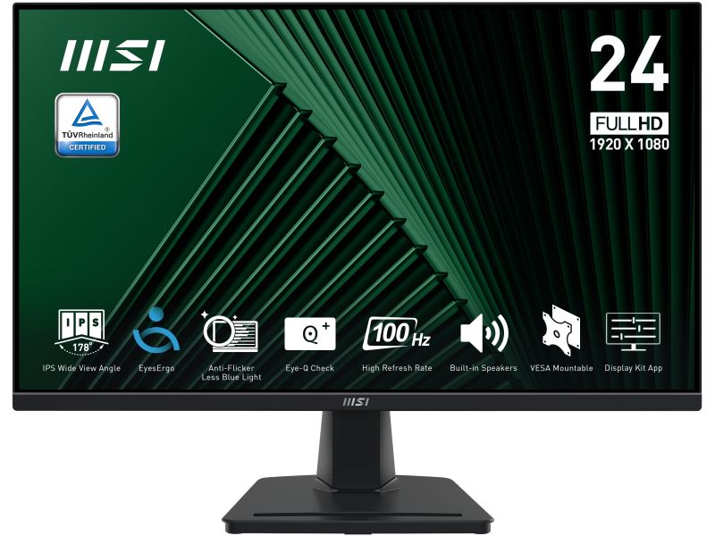 MSI Pro MP245G. Dimensioni diagonale schermo: 60,5 cm (23.8"), Risoluzione del display: 1920 x 1080 Pixel, Tipologia HD: Full HD, Tecnologia display: LCD, Tempo di risposta: 4 ms, Rapporto d'aspetto nativo: 16:9, Angolo di visualizzazione (orizzontale): 178°, Angolo di visualizzazione (verticale): 178°. Altoparlanti incorporati. Montaggio standard VESA. Colore del prodotto: Nero