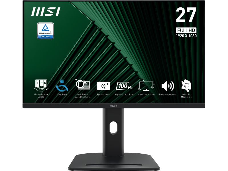 MSI PRO MP275PG. Dimensioni diagonale schermo: 68,6 cm (27"), Risoluzione del display: 1920 x 1080 Pixel, Tipologia HD: Full HD, Tecnologia display: LCD, Tempo di risposta: 4 ms, Rapporto d'aspetto nativo: 16:9, Angolo di visualizzazione (orizzontale): 178°, Angolo di visualizzazione (verticale): 178°. Altoparlanti incorporati. Montaggio standard VESA, Regolazione altezza. Colore del prodotto: Nero