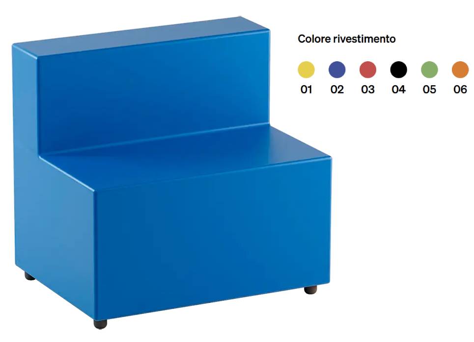 Il rivestimento in similpelle è resistente, piacevole al tatto e facile da pulire, disponibile anche in versione ignifuga (cuscino CAT 1IM, rivestimento Classe 1) per spazi pubblici e contract. La palette di sei colori consente abbinamenti personalizzati e la possibilità di definire codici cromatici per aree tematiche o zone funzionali.