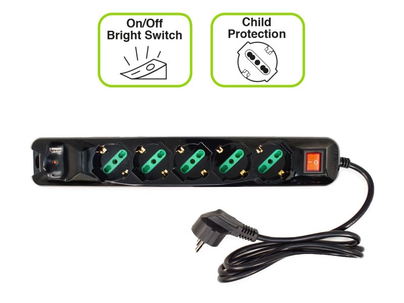 POWER CLEANER 5: INGRESSO SCHUKO - 5 USCITE ITALIA/SCHUKO - 1 PORTA USB-A - 1 PORTA USB-C - TOGETHER ON