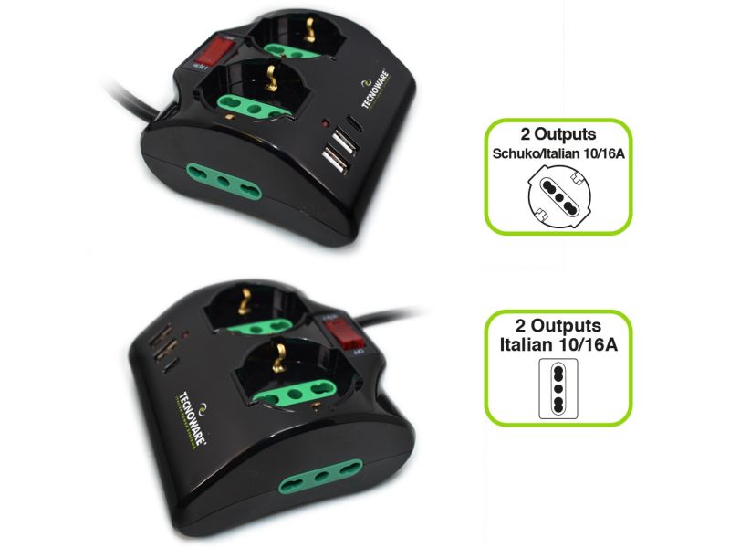 Multipresa Tecnoware con 2 prese Schuko/Italia e 2 prese Italia 10/16A 2xUsb-A e 1xUsb-C con Power Delivery e QC3.0 spina a muro Ita con interruttore On/Off colore Nero
