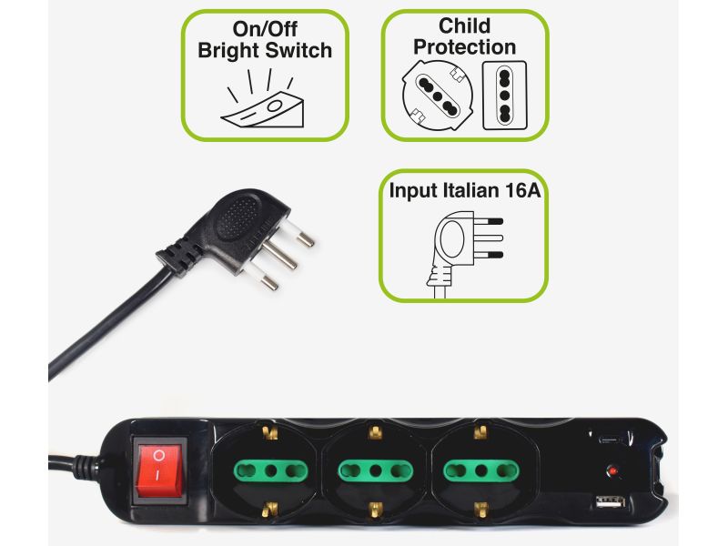 Multipresa Tecnoware con 3 prese Schuko/Ita e 6 prese Italia 10/16A 1xUsb-A e 1xUsb-C con Power Delivery e QC3.0 spina a muro Ita con interruttore On/Off colore Nero