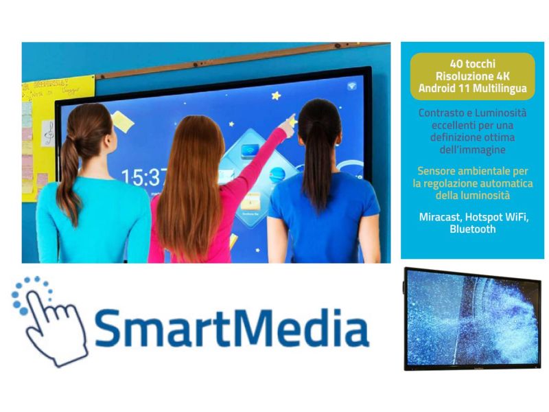 Monitor Touch Interattivo SmartMedia serie MX da 75" uhd 4K con videocamera full hd e 8 microfoni integrati Wi-Fi ram 8gb Android 13 multilingua