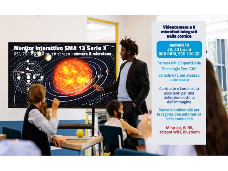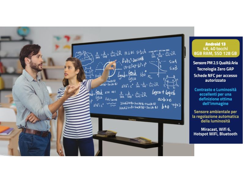 Monitor Touch Interattivo SmartMedia serie MX da 65" uhd 4K con videocamera full hd e 8 microfoni integrati Wi-Fi ram 8gb Android 13 multilingua