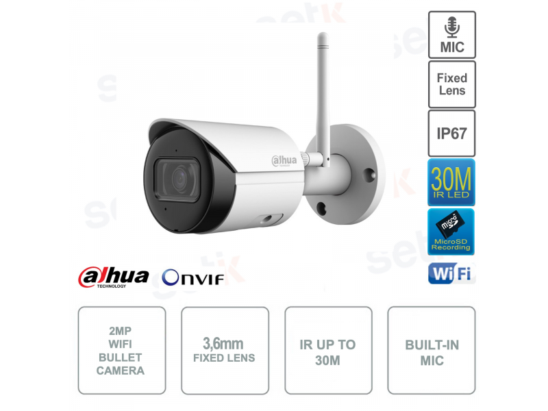Telecamera IP Onvif Dahua 2mpx ottica da 3.6mm Wi-Fi IR 30mt con Microfono e MicroSD IP67 12Volt