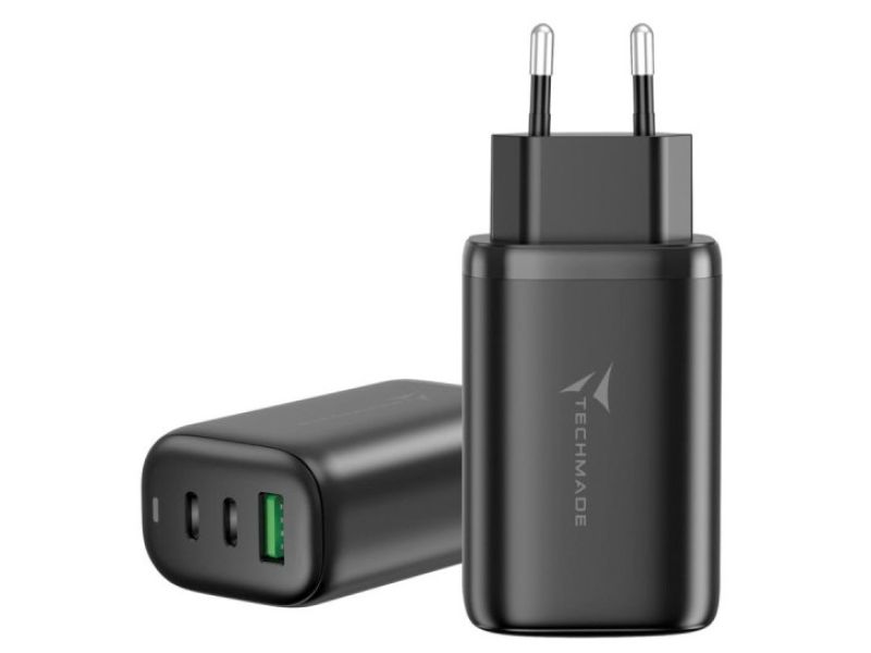 Caricabatterie Techmade da 65 Watt con 1 porta USB-A e 2 porte Type-C supporta QC e PD con tecnologia GaN colore Nero