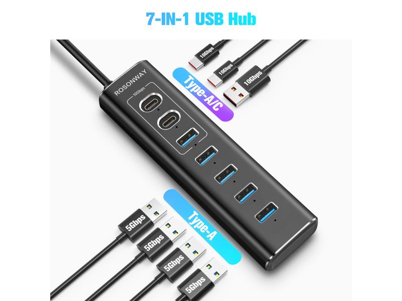 Hub USB 3.2 e USB C RsTech alimentato a 7 porte con USB-A 3.2 da 10 Gbps e 2 USB-C 3.2 e 4 porte USB 3.0