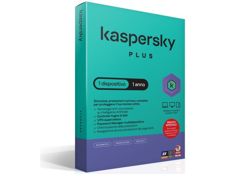 Kaspersky Plus Sicurezza antivirus Full licenza elettronica (attach) 12 mesi per 1 device SuperSlim Box