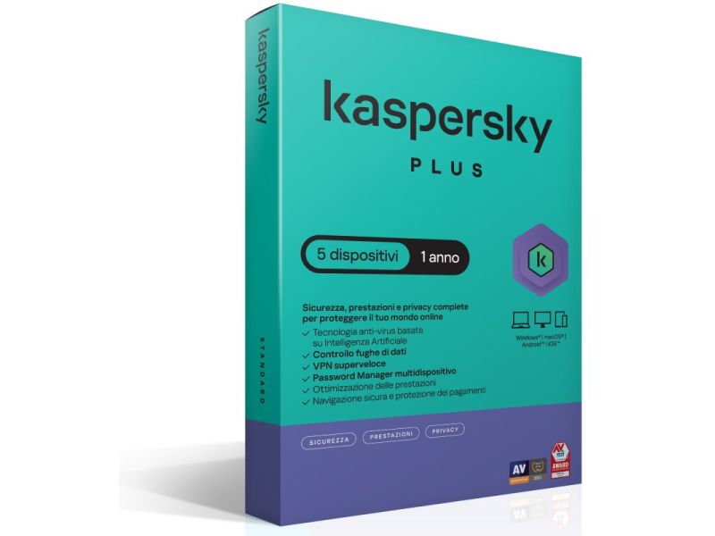 Kaspersky Plus Sicurezza antivirus Full licenza 12 mesi per 5 device SuperSlim Box
