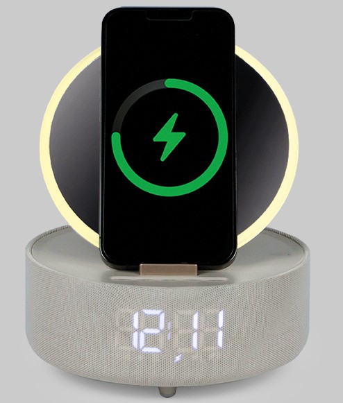 Ricarica in modalità wireless è compatibile con tutti i dispositivi che utilizzano tecnologia Qi. Il multifunzione incorporata di 2000 mAh che alimenta soltanto la lampada accesa con sveglia e orologgio ma per ricaricare il tuo device deve essere collegato ad una presa di corrente.