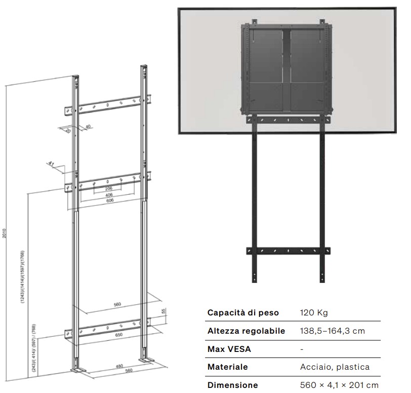 Con una portata massima di 120 kg e altezza regolabile 138,5–164,3 cm, è la soluzione ideale per integrare monitor touch e sistemi didattici o di collaborazione con staffe VESA standard.