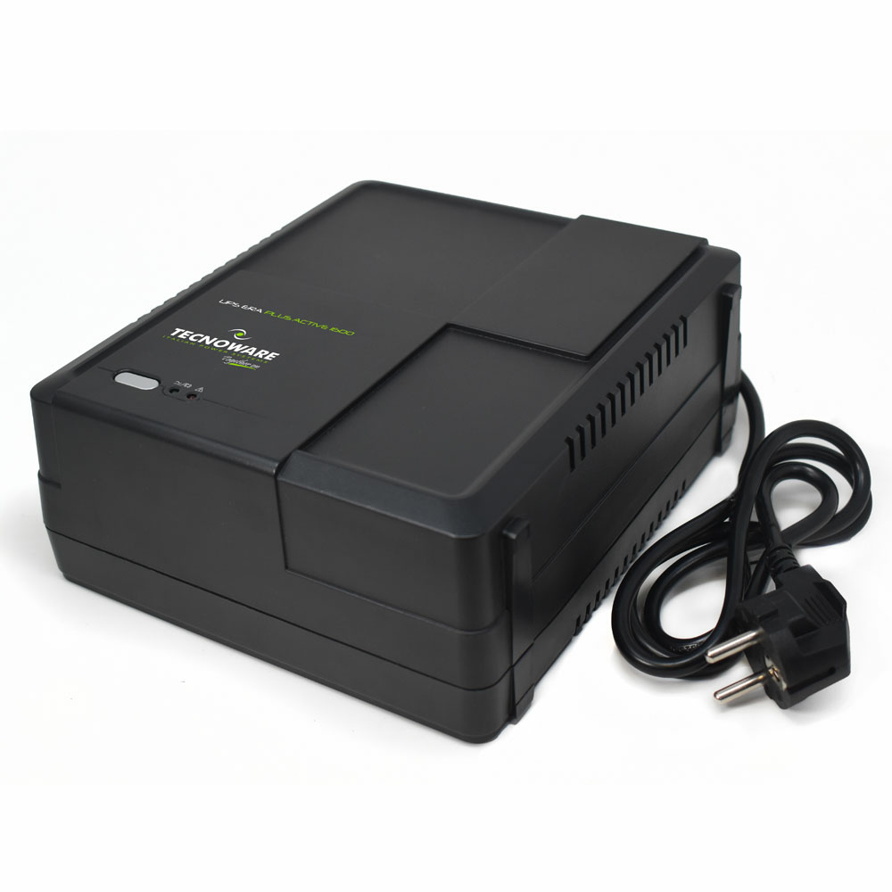 Gruppo di continuità UPS ERA PLUS ACTIVE 1600, Batteria da 12V 11Ah, Dispone di 1 Cavo fisso d'ingresso SCHUKO e 2 uscite SCHUKO protette da Black-Out, sovratensioni e sottotensioni. Tecnologia Line Interactive Plus. Dimensioni 20,7x8,2x22,8 cm, peso 3,1 kg. Dotato di Tasto On-Off con LED multifunzione integrato ad allarme sonoro per la segnalazione dello stato di funzionamento e di interfaccia usb per il controllo gruppo di continuità ups e la programmazione di accensione/spegnimento tramite il software gratuito Tecnomanager Win/Mac. Studiato per proteggere i dispositivi dotati di alimentatore con PFC Attivo come Personal Computer, Console Game, Local Area Networks (LAN) e Sistemi di Sorveglianza. Totalmente silenzioso.