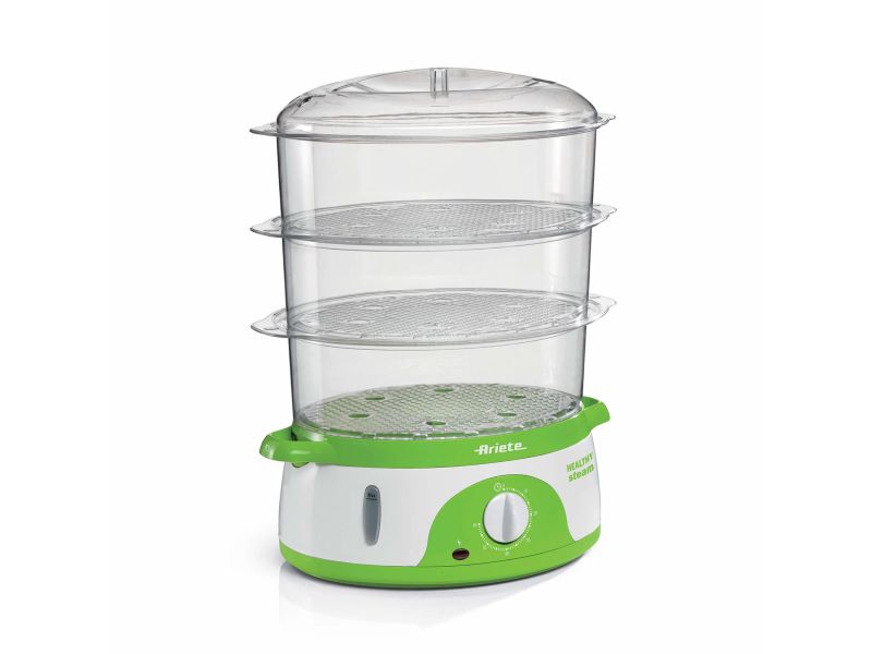 Originaria dei paesi orientali, la cottura a vapore si è diffusa anche in Italia come alternativa nutriente e più gustosa alla cottura in acqua bollente. Le pietanze lesse, infatti, disperdono nell’acqua gran parte delle proprie sostanze nutritive, oltre che quelle aromatiche, perché l’acqua bollente altera consistenza, sapori e profumi. Il vapore, invece, consente una cottura che mantiene pressoché inalterate la quantità di vitamine e sali minerali presenti naturalmente all’interno dei cibi. Il cibo cotto a vapore è sano e la cottura a vapore è preferibile rispetto a quella tradizionale, perché ti permette anche di utilizzare una minor quantità di grassi e condimenti.Con la vaporiera Healthy Steam di Ariete, la cottura a vapore non avrà più segreti, perché potrai cuocere in pochi minuti riso, carne, pesce, crostacei, verdure e uova, ottenendo sempre un sapore corposo e intenso, senza dispersione di sostanze nutritive importanti per la tua dieta. Con i 3 cestelli in dotazione potrai cuocere tante pietanze contemporaneamente, inoltre avrai a disposizione anche un comodo contenitore per la cottura del riso a vapore, perfetto per preparare sushi o piatti della tradizione asiatica. Il serbatoio della vaporiera è facile da riempire anche durante il funzionamento, con il livello dell’acqua visibile. In soli 40 secondi il vapore sarà pronto per la cottura: cuoci, siediti a tavola e gusta i tuoi piatti al vapore!